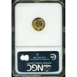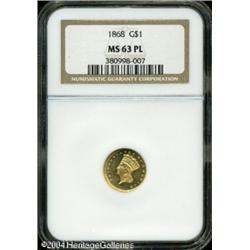 1868 G$1 MS63 Prooflike NGC. Bright peach-gold sur <B>1868 G$1 MS63 Prooflike NGC.</B></I> Bright peach-gold surfaces characterize each side. The devices are exceptionally sharp, and light frosting enhances the contrast with the reflective fields. There are a few inconsequential marks in the fields, but just enough to keep this lovely specimen from a finer grade. From an original mintage of just 10,500 pieces. <BR><BR><B>Important notice:</B> Heritage usually auctions material at the rate of 200-250 lots per hour. On some occasions eBay Live bid software or the Internet may not be able to keep up with the pace of the auction. We recommend placing a realistic absentee bid now as insurance to avoid disappointment. Occasionally the auctioneer may eliminate or reject an eBay Live bid, and the auctioneer may also reopen a lot after the close of the eBay live bidding (usually because we missed an audience bid), and may reject your bid even if it shows you as the winning bidder. By bidding via eBay Live, you agree that Heritage may award the lot to another bidder at its sole discretion under the circumstances described above or any other reasonable circumstances. Since eBay bids are not shown to us until we open the lot on the floor, we treat those bids just like floor bids. In most cases the floor responds before the eBay bid is presented to us, due to Internet lag time, so for consistency we have made it a policy that floor bids are always considered first over tie eBay live bids. Also please note that all Heritage lots purchased through eBay Live carry a 20% Buyer's Premium. Please make sure you read the Terms and Conditions before you bid. This lot is being auctioned in conjunction with a live floor auction by Heritage Galleries & Auctioneers. All final auction and invoice information will be supplied by Heritage Galleries & Auctioneers, and all other information should be considered preliminary. Lot:6466