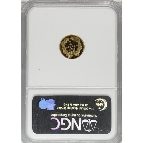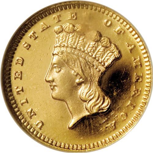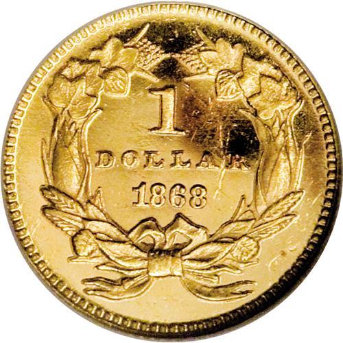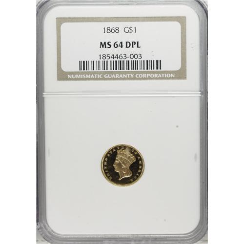<B>1868 G$1 MS64 Deep Mirror Prooflike NGC.</B></I> This is the only 1868 gold dollar with a Deep Mirror Prooflike designation from NGC (4/07). Such a description is usually reserved for Morgan silver dollars, but this piece clearly qualifies. At first glance, it looks just like an extremely rare proof, and it would not surprise us to learn that it might have been offered as a proof in the past. The mirrored fields are exceptional and the devices are highly lustrous. Not only does it look like a Choice Proof, but it has the intense cameo contrast that are found on only a few of the best pieces.<BR><BR><b>Shipping:</b> Coins & Currency (<a target="_blank" href="http://www.heritageauctions.com/common/shipping.php">view shipping information</a>)