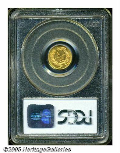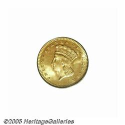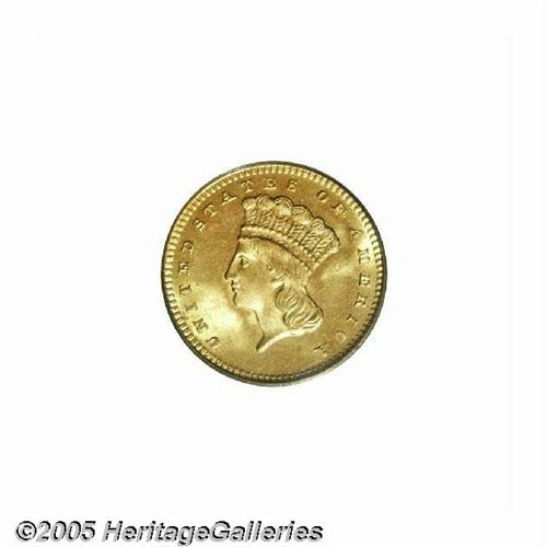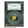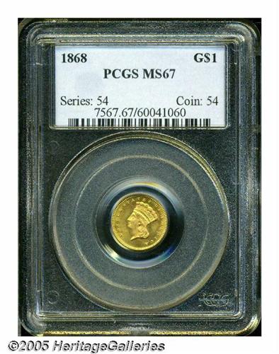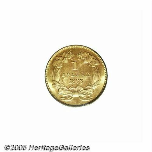 <B>1868<G$1> MS67 PCGS.</B></I> The 1868 is a much more challenging issue than its mintage of 10,500 pieces might indicate. Apparently very few examples were set aside in Mint condition, the vast majority being used in the channels of commerce just after the Civil War. This is an exceptionally pleasing piece that has smooth orange-golden mint frost that is virtually unscathed by post-striking impairments. Sharply defined throughout, the surfaces have a fine granularity from having been struck on a slightly porous planchet. Population: 3 in 67, 1 finer (6/05).