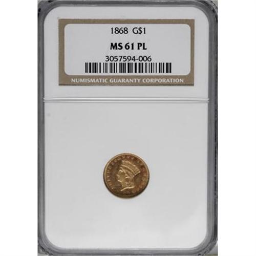 <B>1868 G$1 MS61 Prooflike NGC.</B></I> NGC Census: (4/5). PCGS Population (0/0). Mintage: 10,525. (#77567)<BR><BR><B>Coin Engraver:</B> James B. Longacre<BR><BR><b>Shipping:</b> Coins & Currency (<a target="_blank" href="http://www.heritageauctions.com/common/shipping.php">view shipping information</a>)