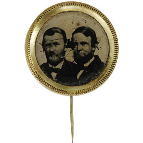 <B>1868 Grant & Colfax Jugate Ferrotype.</B></I> An attractive variety, with conjoined busts and larger-size ferro surface. One black area between portraits and a couple of fine scratches, but still a presentable copy. Original pin. Diameter 23mm.