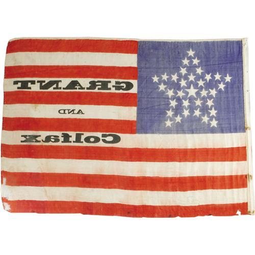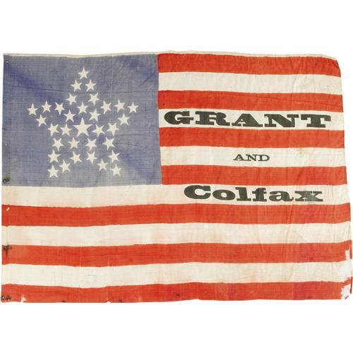 <B>Very Fine 1868 Grant & Colfax Silk Political Flag.</B></I> These campaign flags rank as perhaps the premier category of early political collectibles. Made in various forms and style for most presidential candidates from Harrison in 1840 through the early 20th century, they adorned campaign headquarters, rallies, etc. in great numbers. However, just a comparative handful of these colorful artifacts survive today, and many of those are the lone known examples of that variety. <BR><BR>Star configuration and bold type style combine with vivid color, nice 17" x 12" size, and rarity to make this one of the nicest Grant & Colfax examples we have seen. Light general "aging", and one minor tear by the edge at lower right hand corner; however, we would consider the overall condition to be excellent for the type.