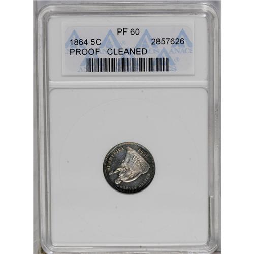 <B>1868<H10C>--Damaged--ANACS, MS60 Details,</B></I> a better low mintage date, numerous groove-like small cuts on the obverse, the reverse rim is scraped near 10:30; and an <B>1864--Cleaned--ANACS, PR60,</B></I> a lightly cleaned and well struck example, lovely gold, rose, and navy-blue toning, only 470 proofs were struck along with just 48,000 business strikes.