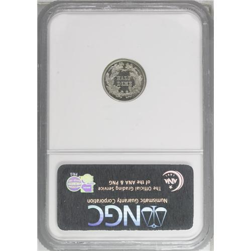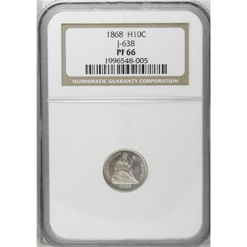 <B>1868<H10C> Half Dime, Judd-638, Pollock-710, Low R.6, PR66 NGC.</B></I> Regular die trials striking of the 1868 half dime. Struck in nickel with a plain edge. It is likely that both the copper and nickel 'trials' of this year were actually deliberately struck for sale to collectors. About a dozen pieces are known of the nickel die trials, including pieces struck on both thick 25 grain and thin 18 grain planchets. A nicely mirrored and pinpoint-sharp piece with faint gold toning. The left obverse field shows a few minute gray pits. Numerous die striations are noted in the fields and were not polished out of the dies prior to striking.