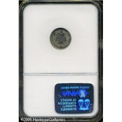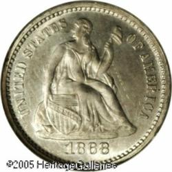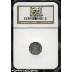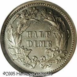 <B>1868 H10C Half Dime, Judd-638, Pollock-710, Low R.6, MS65 NGC.</B></I> Regular die trials striking of the 1868 half dime, struck in nickel with a plain edge. It is possible that both the copper and nickel examples of this die trials issue with plain edges and could be some sort of mint error. Struck on a heavily striated planchet with die clashing evident in the fields, the surfaces are pearl-gray in color and are well preserved. Lot:9845