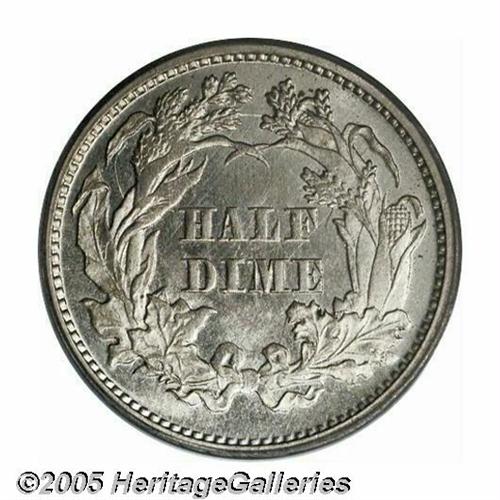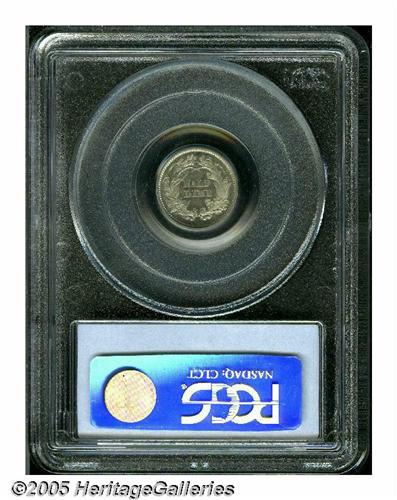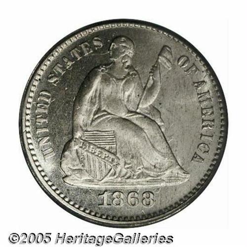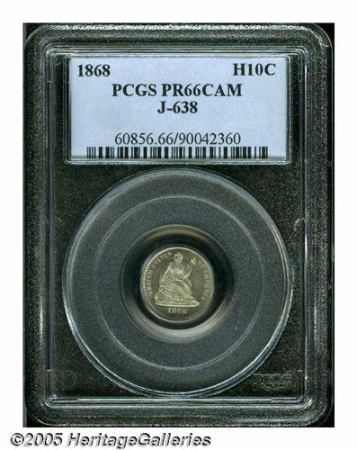 <B>1868<H10C> Half Dime, Judd-638, Pollock-710, Low R.6, PR66 Cameo PCGS.</B></I> Regular die trials striking of the 1868 Half Dime, struck in nickel with a plain edge. Faint clash marks on the obverse, as often seen, and scattered freckles of carbon.<BR><I>From The Western Hills Collection.</B></I>