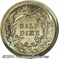 <table><tr><td><table><tr><td>1868 H10C Half Dime, Judd-638, Pollock-710, Low R.6, PR66 Cameo NGC. Regular die trials striking of the 1868 Half Dime, struck in nickel with a plain edge. A well struck and flashy premium Gem that is essentially untoned except for light gold color on Liberty's arm. Struck from moderately clashed dies. <BR><BR><B>Important notice:</B> Heritage usually auctions material at the rate of 200-250 lots per hour. On some occasions eBay Live bid software or the Internet may not be able to keep up with the pace of the auction. We recommend placing a realistic absentee bid now as insurance to avoid disappointment. Occasionally the auctioneer may eliminate or reject an eBay Live bid, and the auctioneer may also reopen a lot after the close of the eBay live bidding (usually because we missed an audience bid), and may reject your bid even if it shows you as the winning bidder. By bidding via eBay Live, you agree that Heritage may award the lot to another bidder at its sole discretion under the circumstances described above or any other reasonable circumstances. Since eBay bids are not shown to us until we open the lot on the floor, we treat those bids just like floor bids. In most cases the floor responds before the eBay bid is presented to us, due to Internet lag time, so for consistency we have made it a policy that floor bids are always considered first over tie eBay live bids. Also please note that all Heritage lots purchased through eBay Live carry a 20% Buyer's Premium. Please make sure you read the Terms and Conditions before you bid. <BR><BR><B>IMPORTANT ANNOUNCEMENT ABOUT RESERVES:</B> Heritage now divulges all reserves on its web site 7 days before every auction. If you want to know whether the reserve on this lot has been met, and if not, what the reserve amount is, please visit this lot page on the HeritageCoin.com web site, or email: bid@HeritageGalleries.com </span></font></td></tr></table></td></tr></table>