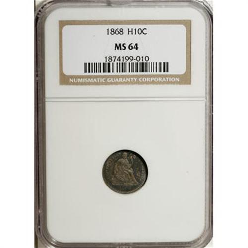 <B>1868 H10C MS64 NGC.</B></I> Dusky olive-gold patina graces the surprisingly reflective obverse of this near-Gem, while the reverse shows green-gold peripheral toning around a sapphire center. Solidly struck and attractively preserved. Census: 20 in 64, 19 finer (8/07).<B><BR></B></I><I>From The Beau Clerc Collection.</B></I><BR><BR><B>Coin Engraver:</B> Christian Gobrecht<BR><BR><b>Shipping:</b> Coins & Currency (<a target="_blank" href="http://www.heritageauctions.com/common/shipping.php">view shipping information</a>)