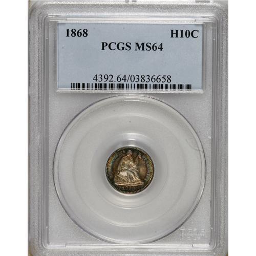 <B>1868 H10C MS64 PCGS.</B></I> Peach centers are framed by lilac, ocean-blue, apple-green, and canary-gold. Nicely struck and lustrous with smooth surfaces. Since silver coins little circulated in 1868, only 88,600 pieces were struck. Population: 12 in 64, 20 finer (3/07).<BR><BR><b>Shipping:</b> Coins & Currency (<a target="_blank" href="http://www.heritageauctions.com/common/shipping.php">view shipping information</a>)