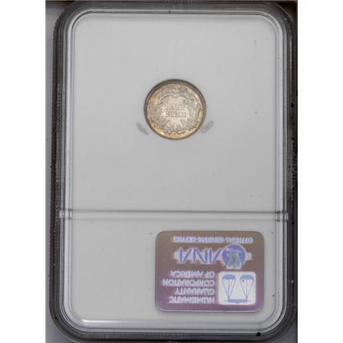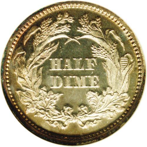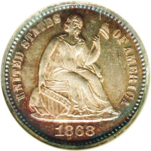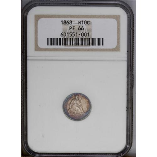 <B>1868<H10C> PR66 NGC.</B></I> Beautifully toned with royal blue and magenta-gold near the rims, lighter silver-gray to the centers. The devices show ample frost to complete the contrast with the reflective fields. Boldly struck throughout and exceptional quality for this date. If you demand eye appeal and outstanding surfaces, then here is one to pursue. Census: 3 in 66, 5 finer (1/06).<BR><I>From The Larj Collection.</B></I>