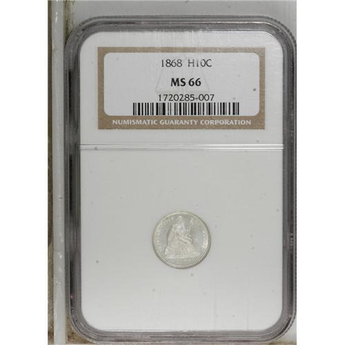 <B>1868 H10C MS66 NGC.</B></I> The 1868, with a business strike mintage of 88,600 pieces, is one of the better dates in the Seated half dime series. Premium Gem and finer coins are especially difficult to come by; NGC and PCGS have seen just eight MS66 examples, and seven specimens finer. The MS66 in the current lot displays snow-white surfaces and is well defined on its design elements. Some light die clash marks are noted on each side, and a squiggly lint mark occurs beneath the D in UNITED. Census: 3 in 66, 5 finer (4/07).<BR><BR><b>Shipping:</b> Coins & Currency (<a target="_blank" href="http://www.heritageauctions.com/common/shipping.php">view shipping information</a>)