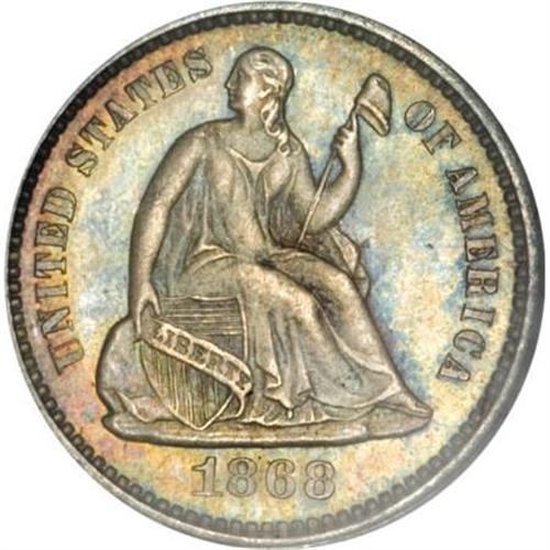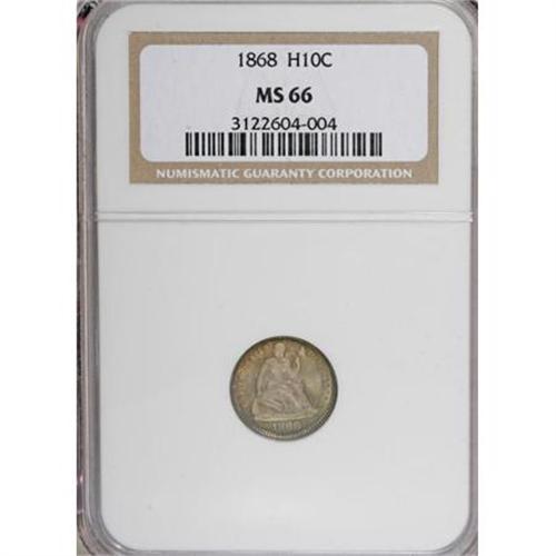 <B>1868 H10C MS66 NGC.</B></I> Glowing luster shines through medium intensity multicolored reverse toning, and through lighter hues of the obverse palette. A sharp strike leaves great definition on the design elements, and well cared for surfaces characterize each side. A lovely Premium Gem example of this better date issue. Census: 4 in 66, 6 finer (12/07).<BR><I>From The John Stimson, Sr. Collection, Part One.</B></I><BR><BR><B>Coin Engraver:</B> Christian Gobrecht<BR><BR><b>Shipping:</b> Coins & Currency (<a target="_blank" href="http://www.heritageauctions.com/common/shipping.php">view shipping information</a>)