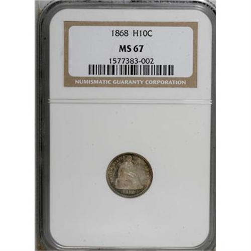 <B>1868 H10C MS67 NGC.</B></I> Splashes of autumn-brown and aquamarine endow this moderately prooflike Superb Gem. The reverse appears pristine, and the obverse field has only subtle imperfections, mostly near the cap and STATES. The strike is good, with the usual minor merging of detail seen on the cereal grains opposite the left corner of Liberty's rock. Only 88,600 pieces were struck. Census: 5 in 67, 0 finer (10/07).<BR><BR><B>Coin Engraver:</B> Christian Gobrecht<BR><BR><b>Shipping:</b> Coins & Currency (<a target="_blank" href="http://www.heritageauctions.com/common/shipping.php">view shipping information</a>)