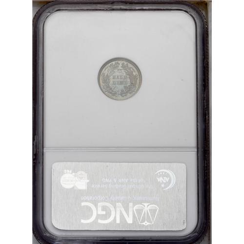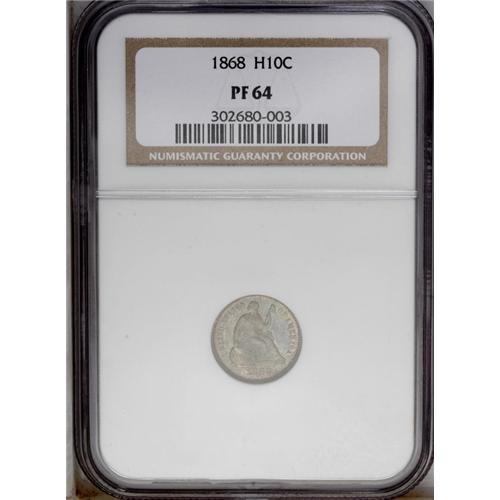 <B>1868<H10C> PR64 NGC.</B></I> Autumn-brown and aquamarine tones embrace the undisturbed and flashy fields. Portions of the left side wreath are incompletely defined by the dies. Just 600 proofs were struck. Census: 49 in 64, 43 finer (1/06).