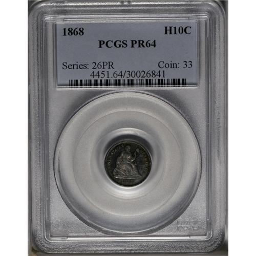 <B>1868<H10C> PR64 PCGS.</B></I> A deeply toned near-Gem that displays rich rose, aqua, and gold colors. The upper left portion of the wreath is not fully struck, but the surfaces are certainly above reproach. Just 600 proofs were minted, and business strike production was also low. Population: 46 in 64, 32 finer (6/06).