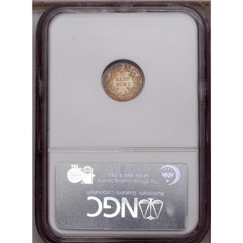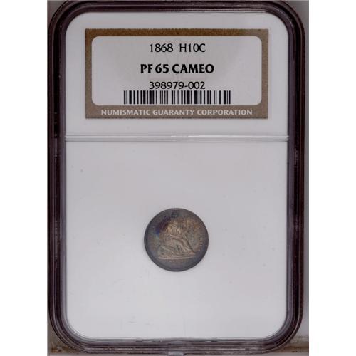 <B>1868<H10C> PR65 Cameo NGC.</B></I> The strike is generally crisp, even though portions of the upper left wreath are weak. The fields are highly reflective, and reveal rainbow iridescence on the obverse. Golden toning is the most prominent on the reverse, and both sides are free of bothersome hairlines or contact marks. Only 600 of the 89,200 half dimes struck in 1868 were proofs. Census: 4 in 65 Cameo, 0 finer (1/06).