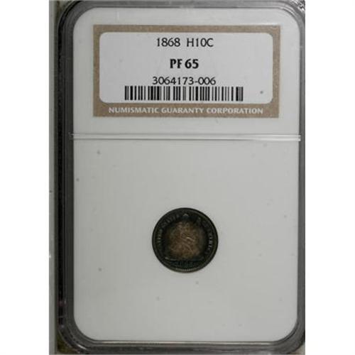 <B>1868 H10C PR65 NGC.</B></I> Concentric jewel-toned bands of sea-green and sapphire surround rose-gold centers on this diminutive Gem. Sharply struck with well-preserved surfaces that gleam beneath the patina. One of only 600 specimens struck. Census: 25 in 65, 19 finer (9/07).<BR><BR><B>Coin Engraver:</B> Christian Gobrecht<BR><BR><b>Shipping:</b> Coins & Currency (<a target="_blank" href="http://www.heritageauctions.com/common/shipping.php">view shipping information</a>)