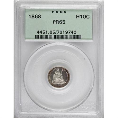 <B>1868 H10C PR65 PCGS.</B></I> Autumn-brown patina clings to the borders. This lovely Gem has icy devices, but lacks a Cameo designation since it is housed in a green label holder. A mere 600 proofs were struck. Population: 19 in 65, 12 finer (4/07).<BR><I>From The Vanek Collection.</B></I><BR><BR><b>Shipping:</b> Coins & Currency (<a target="_blank" href="http://www.heritageauctions.com/common/shipping.php">view shipping information</a>)