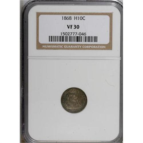 <B>1868 H10C VF30 NGC.</B></I> NGC Census: (1/58). PCGS Population (0/55). Mintage: 88,600. Numismedia Wsl. Price for NGC/PCGS coin in VF30: $173. (#4392)<BR><BR><B>Coin Engraver:</B> Christian Gobrecht<BR><BR><b>Shipping:</b> Coins & Currency (<a target="_blank" href="http://www.heritageauctions.com/common/shipping.php">view shipping information</a>)