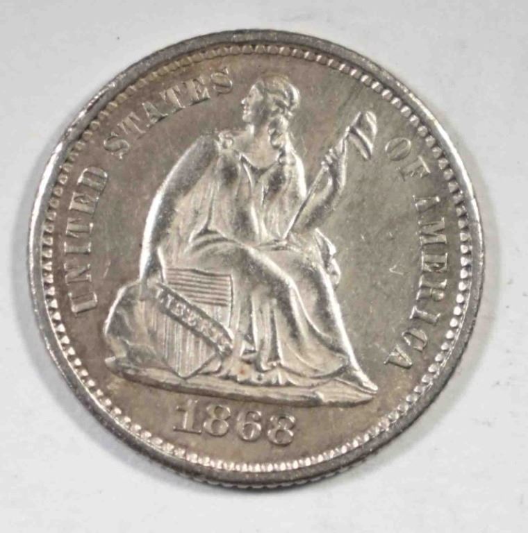 1868 SEATED LIBERTY HALF DIME CH BU WHITE, RARE ESTIMATE $900 - $950.