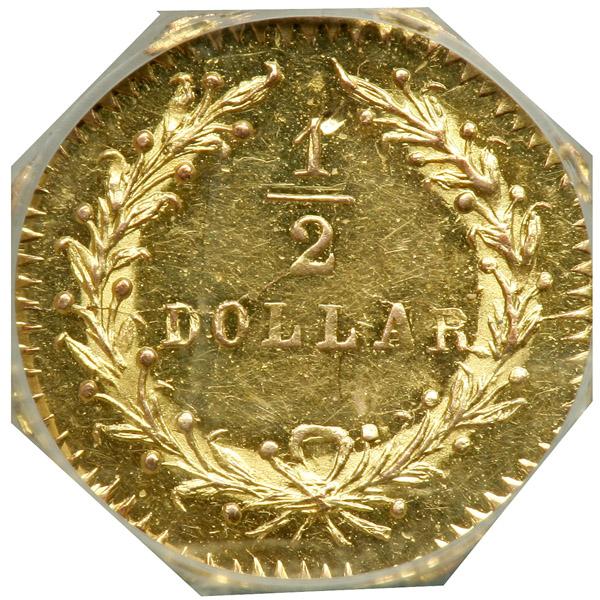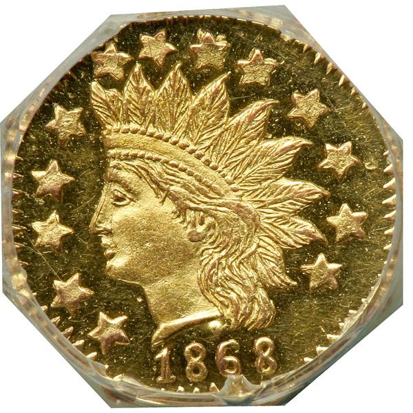 "1868" Half Dollar Octagonal. Breen and Gillio-961. Rarity 7. NGC graded MS-63 Prooflike. Blazing brilliant surfaces. Gorgeous two-tone cameo between frosted gold Indian head and deeply reflective mirrors. A very attractive design of one of the back-dated pieces. Pop 1; 1 finer in 64 PL.
