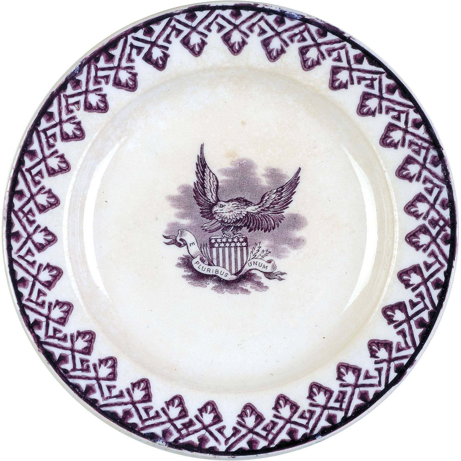 1868 Historical Staffordshire Mulberry Plate with Heraldic American Eagle with a Banner Reading "E Pluribus Unum"