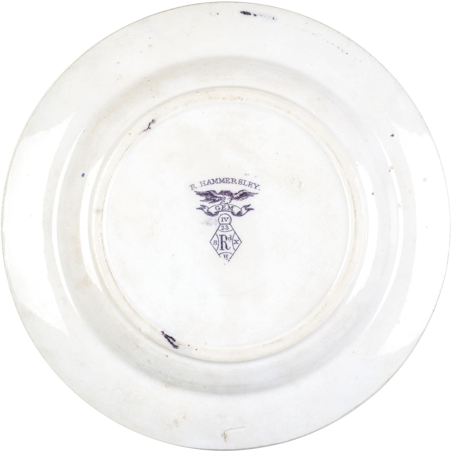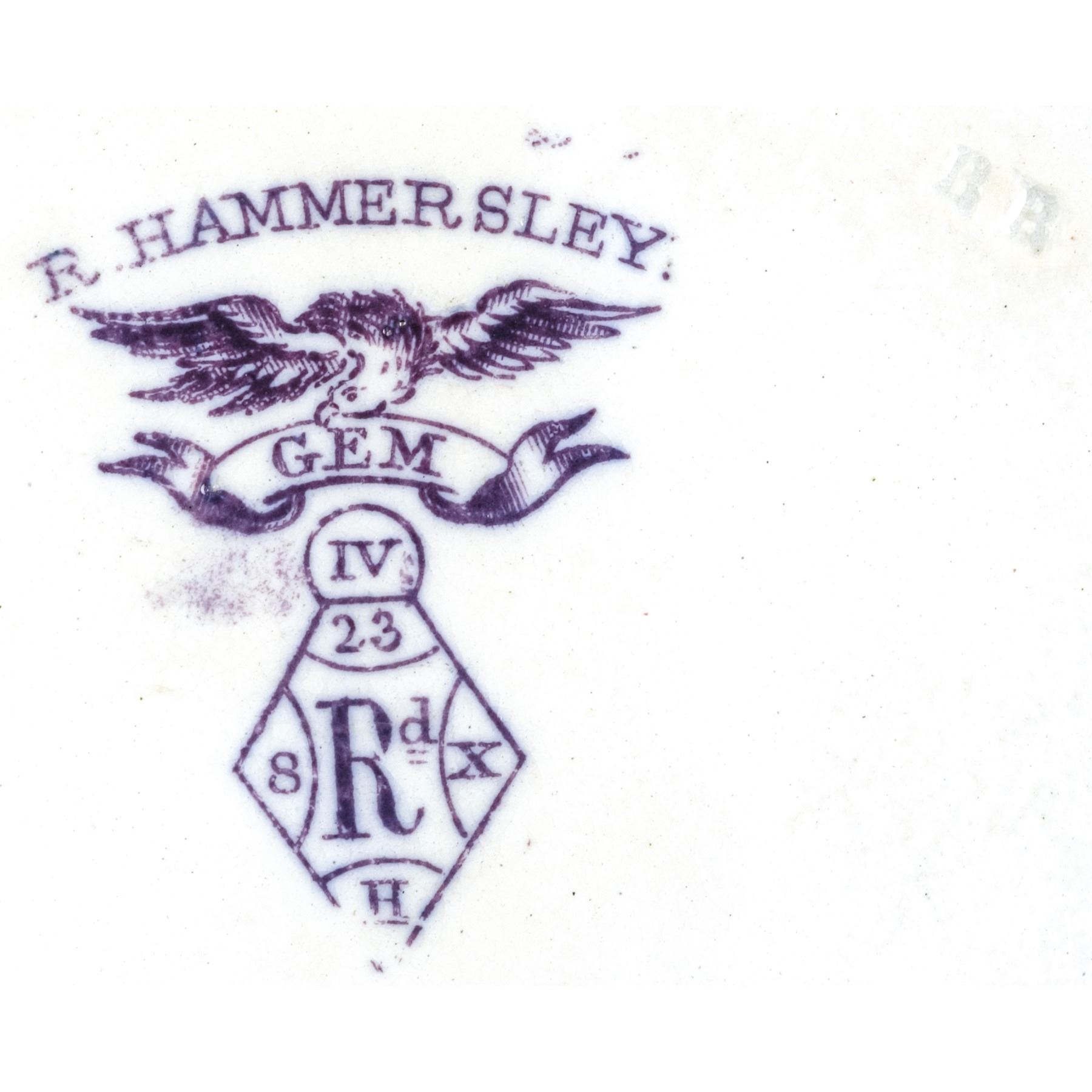 1868, Historical Staffordshire Mulberry Transferware Gem Pattern by Hammersley