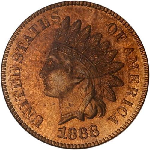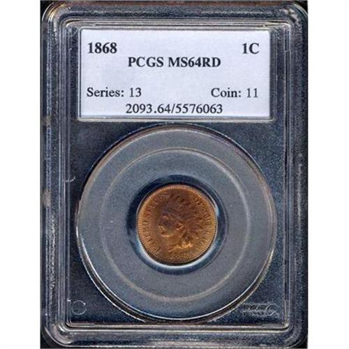 <b>1868 Indian Head Cent. PCGS graded MS64 R.</b> Full red, undisturbed mint luster that is deep and slightly wood grain in its effect as on many surviving Mint States of this scarce issue. Moving along, we can gladly report a highly presentable strike, with boldness to the main feather parts comprising the "vexillum" or shaft, "vane," and "barbs." <b>(PCGS # 2093)</b>