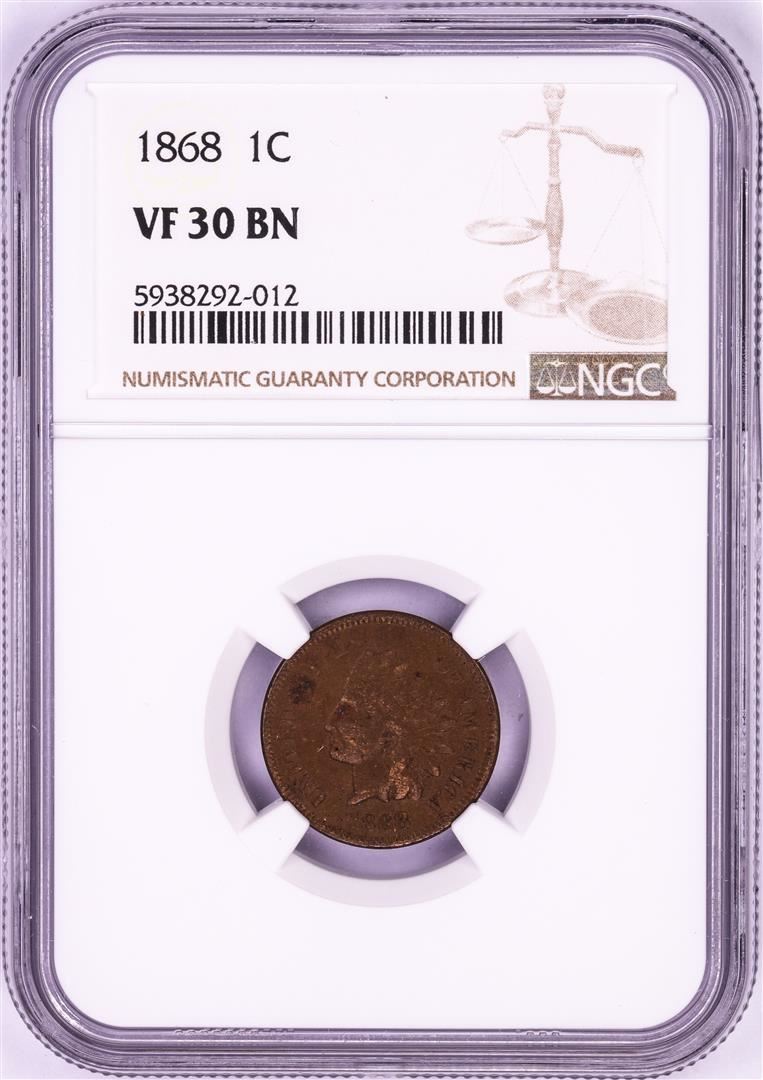 One 1868 Indian Head Cent Coin NGC VF30BN. NGC Certified.