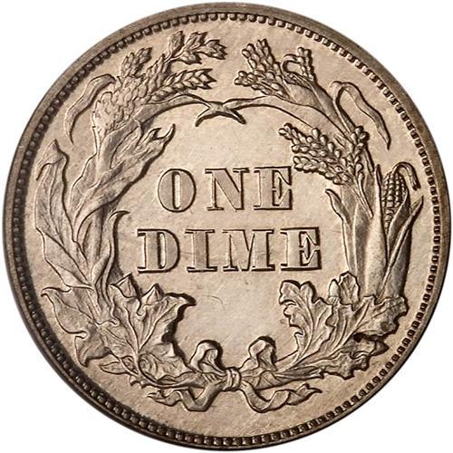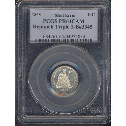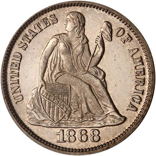 Mintage of this date is 600 proofs. Variety 105-Obverse 5 Blundered Date. This very dramatic mis-punched die has two extra "1"'s punched into Liberty's base. This 1868 Seated Liberty Dime was discovered by Walter Breen, and first listed by Kam Ahwash. It is listed in Breen reference work as Breen #3345.