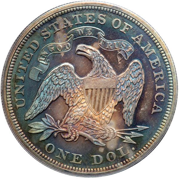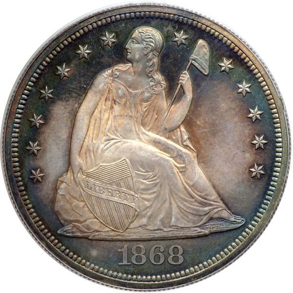 1868. PCGS graded Proof 65+. Magnificent multicolor toning on both sides. A monster coin! Only 600 minted. Like the Proof minor denominations of the same date, Proof 1868 Silver Dollars seem to have all been struck with care by the dies and focus on detail by the Mint’s technicians. Proof 1868 Dollars are evenly distributed over the lower-range of the grade spectrum, but turn rare at this grade level and above, as one can see from the roster provided. The offering of this coin presents a rare opportunity for the specialist to acquire one of the finest known outside institutional holdings. Pop 1; 4 finer, 3 in 66, 1 in 67 (PCGS # 7016) .