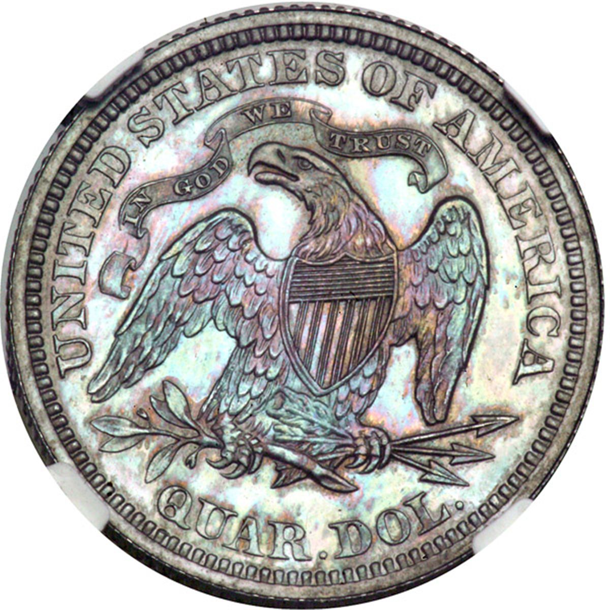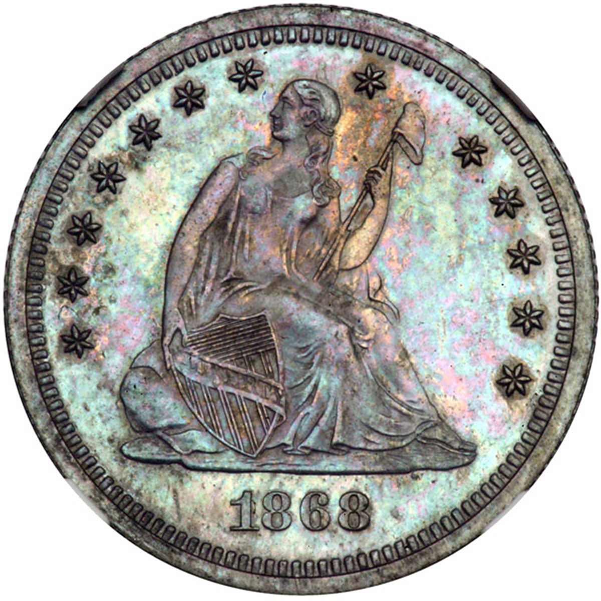 1868 Liberty Seated Quarter Dollar. NGC graded Proof 64. Beautiful midnight blue toning with slight iridescense. Bold detail on Liberty, eagle, stars and legends, with swirling mirror reflection below the color. Only 600 minted. Pop 27; 30 finer .