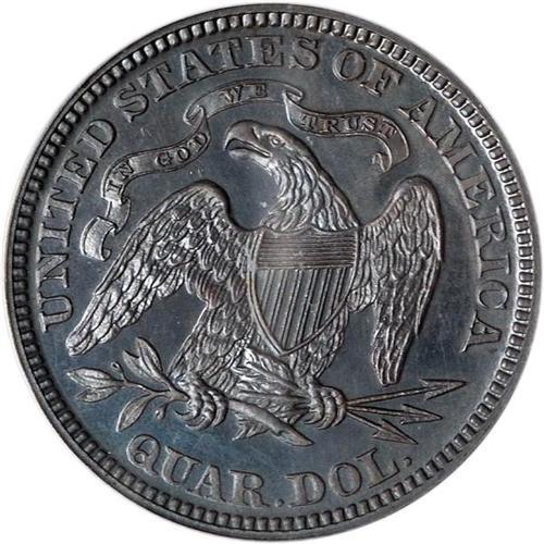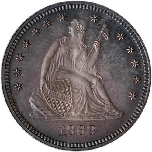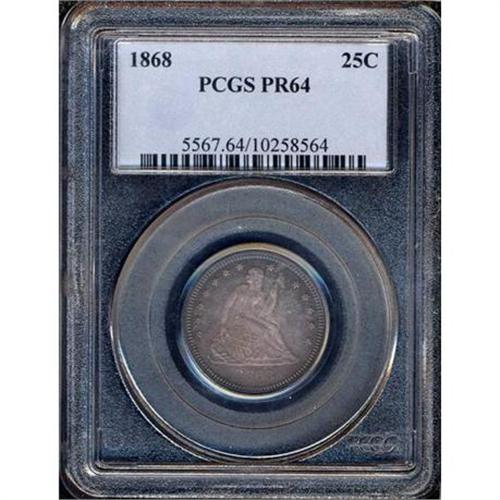 <b>1868 Liberty Seated Quarter Dollar. PCGS graded Proof 64.</b> Glowing smooth mirror finish characterizes the surfaces on this lovely choice toned piece. The devices were struck with the usual force and energy by the specially made dies that all design elements show boldly. Coinage totaled 600 pieces in 1868 <b>(PCGS # 5567)</b> <i>