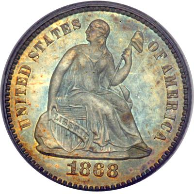 1868 Liberty Seated Half Dime. PCGS graded Proof 67. Lovely gold, green and blue toning. 600 struck. This lovely Superb Gem is blazing with reflective luster underneath the iridescent color, but we are hard pressed to find even a single carbon fleck or visible hairline on either side. Having that in mind for the mint originality, we see as well a full, bold transfer from die to planchet notable in all the main devices along with the letters in the legends and a bold date. A glorious specimen. After viewing this piece, unsuccessful bidders in the sale will sense the injustice of fate in letting this one get away from them! Maybe next time. Pop 2; none finer at PCGS. (PCGS # 4451).