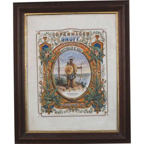 1868 Multi color litho ad Copenhagen Snuff shows Indian warrior THOS Hunter Litho Philadelphia, framed 19" x 23" one of the earliest Litho ads