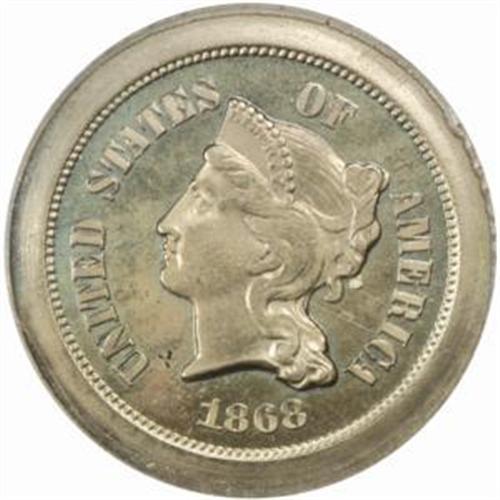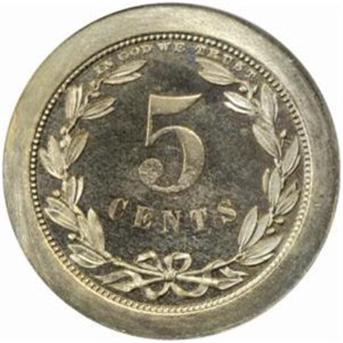 <style type="text/css"> body, td, th { font-family: Arial, Helvetica, sans-serif; font-size: 12px; color: #482424; margin: 0px; padding: 0px; } #header { background-image: url(http://www.bowersandmerena.com/ebay/images/template_v3_01.gif); clear: both; background-color: #590303; border-top-width: 2px; border-top-style: solid; border-top-color: #B38C4F;}#header #header_wrapper { height: 75px; clear: both; width: 800px; margin-right: auto; margin-left: auto; background-image: url(http://www.bowersandmerena.com/ebay/images/template_v3_03.gif); background-repeat: no-repeat; background-position: right; color: #F3EDCC;}#header #header_wrapper #header_logo { float: left; height: 75px; width: 444px; background-image: url(http://www.bowersandmerena.com/ebay/images/template_v3_02.gif); background-repeat: no-repeat; font-size: 10px; text-transform: capitalize; color: #B38C4F;}#header #header_wrapper #header_right { float: left; height: 75px; width: 356px; text-align: right;}#header #header_wrapper #header_right #headerLoginBtn { margin-bottom: 30px;}#header #header_wrapper #header_right input#txtSearch { color: #B49056; border: 1px solid #B49056; width: 175px; padding-top: 3px; padding-right: 3px; padding-bottom: 4px; padding-left: 3px;}#nav { height: 37px; background-image: url(http://www.bowersandmerena.com/ebay/images/template_v3_05.gif); clear: both;}#nav #nav_wrapper { height: 35px; width: 800px; margin-right: auto; margin-left: auto; border-left-width: 1px; border-left-style: solid; border-left-color: #B38C4F;}#nav #nav_wrapper a { padding-right: 15px; padding-left: 15px; border-right-width: 1px; border-right-style: solid; border-right-color: #B38C4F; height: 25px; padding-top: 10px; display: block; float: left; text-decoration: none; font-weight: bold; color: #5D0303;}#nav #nav_wrapper a:hover { color: #B38C4F;}#nav #nav_wrapper #search { float: right; padding-top: 7px;}#nav #nav_wrapper #search #txtSearch { font-family: Arial, Helvetica, sans-serif; font-size: 10px; text-transform: uppercase; color: #D2AE75; border: 1px solid #B38C4F; padding: 3px;}#content_bgd { background-image: url(http://www.bowersandmerena.com/ebay/images/template_v3_09.gif); background-repeat: repeat-y; background-position: center; padding-top: 15px; padding-bottom: 15px; background-color: #FBFBDB;}#content_wrapper { clear: both; height: auto; width: 800px; margin-right: auto; margin-left: auto;}.LotDetailWhite{ line-height:normal; font-size:13px; font-family: arial,helvetica,sans-serif; color: White; font-weight: bold;}.LotDetailInformation{ line-height:normal; font-size: 13px; font-family: arial,helvetica,sans-serif;}.LotDetailMessage{ line-height:normal; font-size: 13px; font-family: arial,helvetica,sans-serif; color: red;}}tr.HeaderAuctionTitle td { color: #000000; font-weight: bold; padding: 2px; background-image: url(http://www.bowersandmerena.com/ebay/images/template_v3_05.gif); background-repeat: repeat-x; border-bottom-width: 1px; border-bottom-style: solid; border-bottom-color: #B38C4F;}table.AuctionSummary a, table.AuctionSummary a:link, table.AuctionSummary a:visited { color: #0000FF; text-decoration: none;}}td.tableHeaderLeft { border-left-width: 1px; border-left-style: solid; border-left-color: #B38C4F;}td.tableHeaderRight { border-right-width: 1px; border-right-style: solid; border-right-color: #B38C4F;}td.tableCellMiddle { border-left-width: 1px; border-left-style: solid; border-left-color: #B38C4F; border-right-width: 1px; border-right-style: solid; border-right-color: #B38C4F; padding: 5px;}tr.footer td { border-top-width: 1px; border-top-style: solid; border-top-color: #B38C4F;}</style></head><body><div id="header"> <div id="header_wrapper"> <div id="header_logo"> </div> <div id="header_right"> </div> </div></div><div id="nav"> <div id="nav_wrapper"> <a href="http://www.bowersandmerena.com">Our eBayLive Auctions</a> <a href="#PaymentInfo">Payment Information</a> <a href="#ShippingInfo">Shipping Information</a> <a href="#About">About Bowers and Merena</a> </div></div><div id="content_bgd"> <div id="content_wrapper"> <table width="100%" border="0" cellpadding="5" cellspacing="0" class="AuctionSummary"> <tbody> <tr class="HeaderAuctionTitle" style="height: 25px;"> <td align="left" class="tableHeaderLeft" > </td> <td align="center" class="tableHeaderRight"> <span style="font-size: large;">Lot #967. 1868 Pattern Five-Cent Piece. Judd-624, Pollock-693. Rarity-6-. Proof-65 (PCGS). OGH (Old Green Holder).</span> </td> </tr> <tr> <td colspan="3" class="tableCellMiddle"> A bust of Liberty faces left on the obverse with the legend UNITED STATES OF AMERICA around the border and the date 1868 below. This design is very similar to that which the Mint used to strike regular-issue Three-Cent Nickels from 1865 through 1889. On the reverse, a laurel wreath surrounds the denomination 5 CENTS with the motto IN GOD WE TRUST above. Struck in nickel on a broad planchet and with a plain edge. Lovely golden-gray patina adorns both sides, the color a bit warmer and more widely distributed on the obverse than it is on the reverse. Well struck throughout, an otherwise satiny finish reveals decided reflective qualities in the reverse field. There are no significant blemishes save perhaps for a couple of trivial alloy spots in the lower-left obverse field.