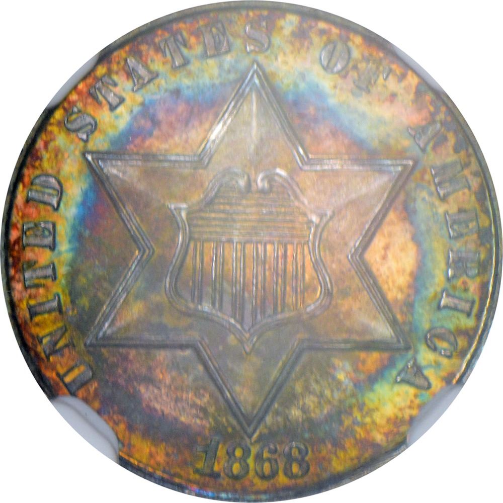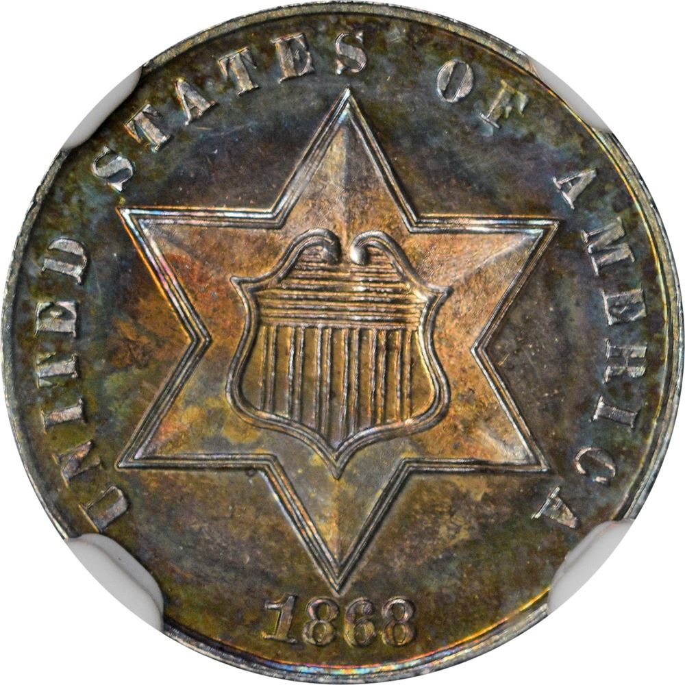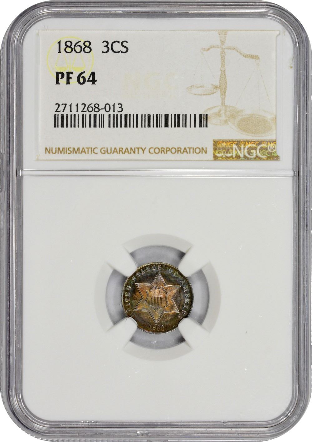 A colorful amalgam of rose, gold, crimson, and blue iridescence enlivens both sides of this attractive Proof trime. One of 600 Proofs of the date, a figure that allows for today’s collectors to enjoy stewardship of an example; only 3,500 circulation strikes were produced.