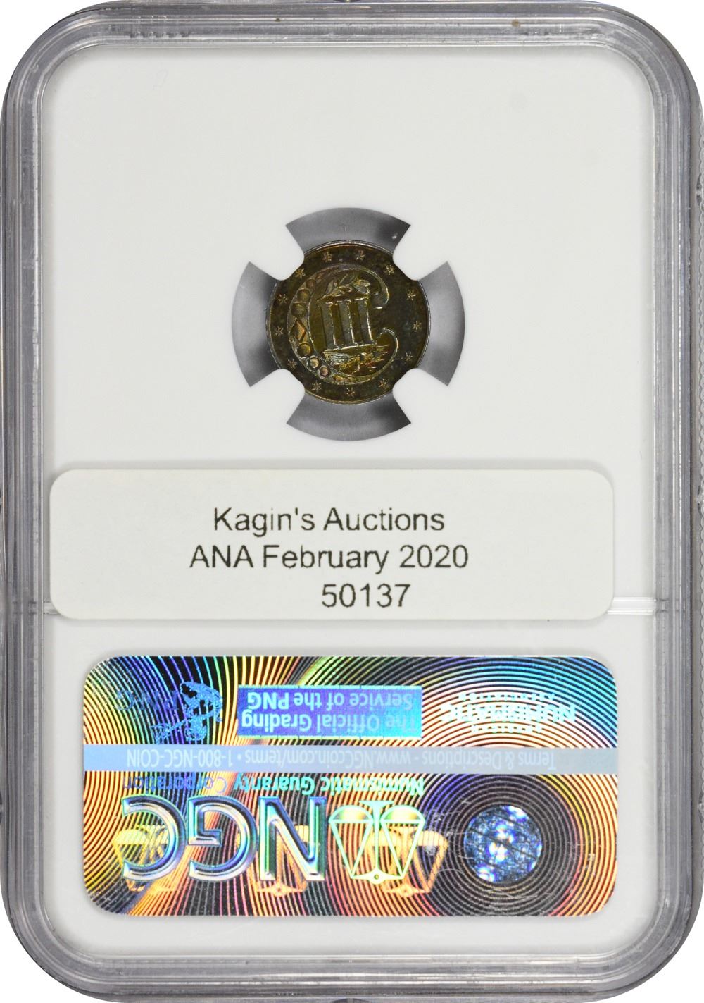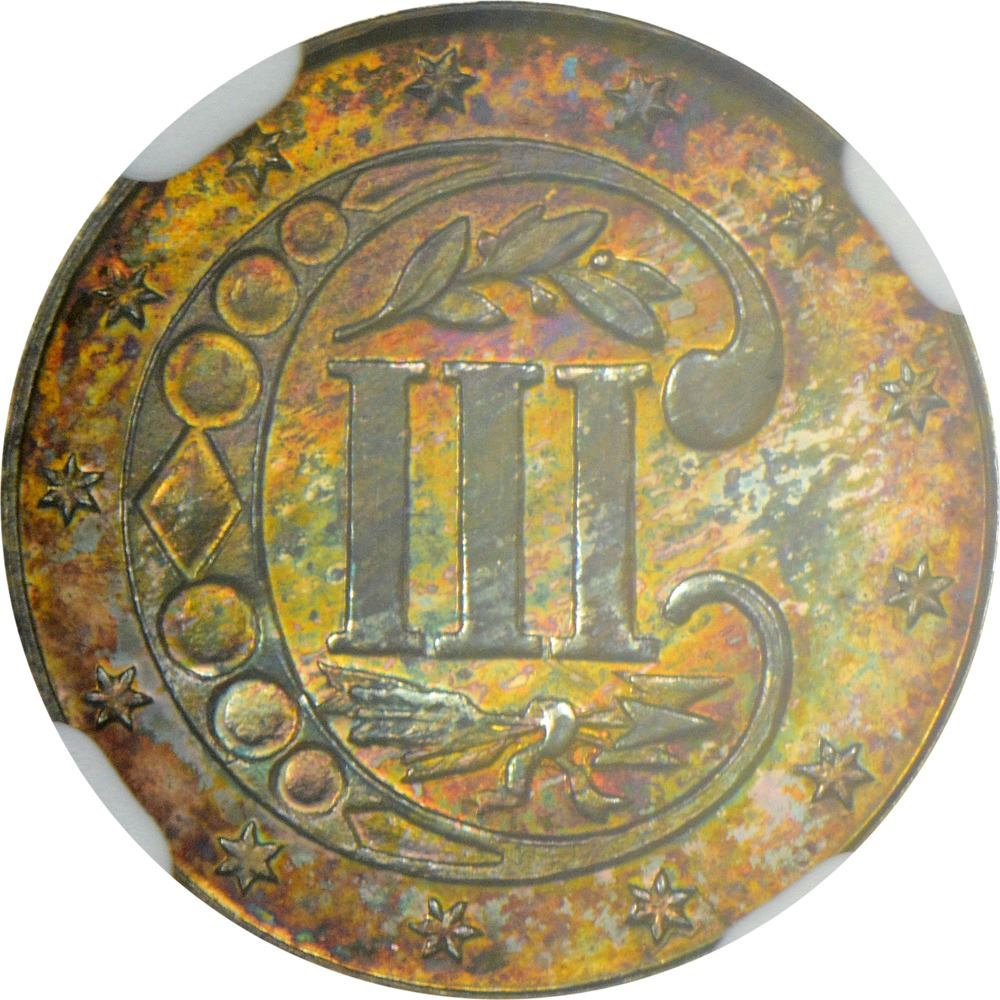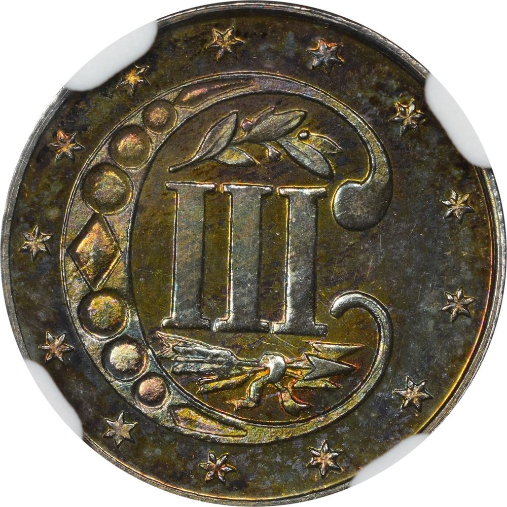 A colorful amalgam of rose, gold, crimson, and blue iridescence enlivens both sides of this attractive Proof trime. One of 600 Proofs of the date, a figure that allows for today’s collectors to enjoy stewardship of an example; only 3,500 circulation strikes were produced.