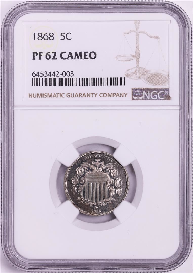 One 1868 Proof Shield Nickel Coin NGC PF62 Cameo. NGC Certified.