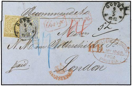 1868 Registered envelope to ENGLAND bearing 2 g blue (SG 8) and 5 g bistre (SG 10) tied by GOTHA datestamp with boxed CHARGE and manuscript "Recommede", sent PD with CROWN/REGISTERED in red and oval REGISTERED LONDON 6 MAY 1868 FROM PRUSSIA in red applied on arrival. Very fine item of charged mail.