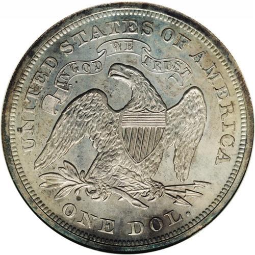 <B>1868<img border='0' src='http://www.heritagecoins.com/images/star.gif' width=10 height=10>$1> PR63 ANACS.</B></I> Blended golden-brown and steel-blue hues blanket this unmarked specimen. The strike is sharp overall, although the shoulders of Liberty and the eagle show a hint of softness. The 1 and final 8 in the date are lightly repunched, and the reverse is moderately die doubled. Only 600 proofs were struck.