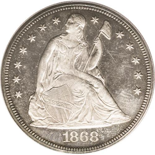 <B>1868<img border='0' src='http://www.heritagecoins.com/images/star.gif' width=10 height=10>$1> PR64 Cameo PCGS.</B></I> Each side has a stripe of deep purple-gray patina through the center, with lilac-gold accents elsewhere and glints of ice-blue and russet at the rims. The excellent field-device contrast fully merits the Cameo designation. This well struck example is one of the survivors from the proof mintage of only 600 pieces during this Reconstruction-era year. Population: 14 in 64 Cameo, 3 finer (9/06).