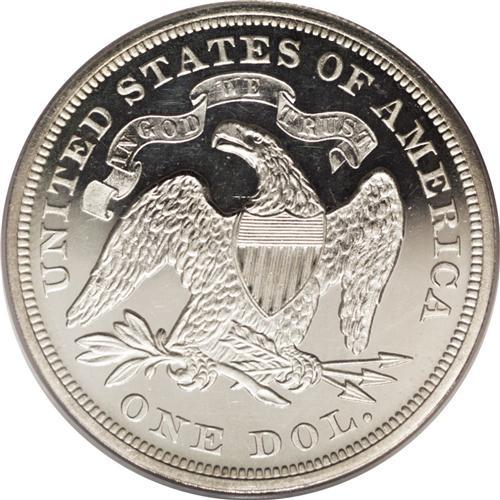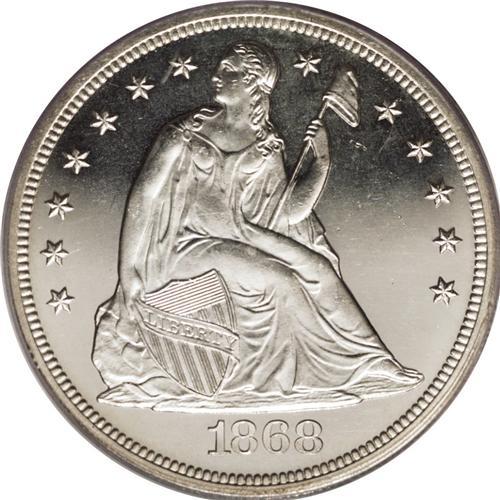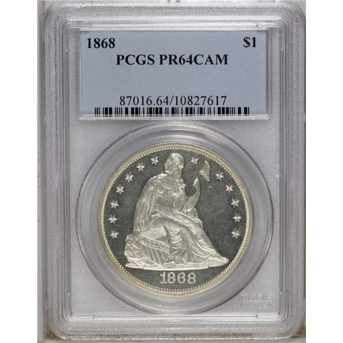 <B>1868 S$1 PR64 Cameo PCGS.</B></I> With only 600 specimens minted, any proof from this issue is a prize, and this is doubly so for this remarkable Choice Cameo proof. The fields are deeply reflective, and delicate ice-white frost with a hint of ivory graces the exquisitely detailed devices. Light haze and minor hairlines in the fields deny this coin a Gem grade, though this is unlikely to be of great concern for the winning bidder. Population: 16 in 64 Cameo, 3 finer (12/06).<BR><BR><b>Shipping:</b> Coins & Currency (<a target="_blank" href="http://www.heritageauctions.com/common/shipping.php">view shipping information</a>)