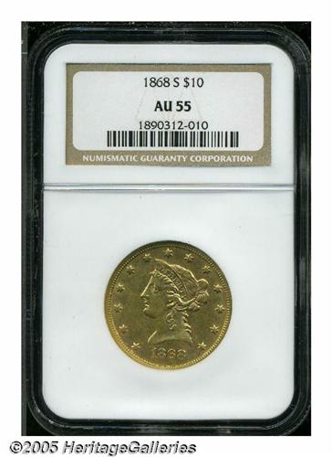 <B>1868-S<$10> AU55 NGC.</B></I> An issue that is still unknown in Mint State, the 1868-S is one of the premier rarities among S-mint eagles. Only 13,500 pieces were produced, and the average survivor is apt to grade no finer than VF. For a circulated eagle, this coin is remarkably smooth. There are several scattered abrasions, but none of these features are sizeable or individually distracting. The central devices are well defined, and the color is a pleasing golden-rose shade.