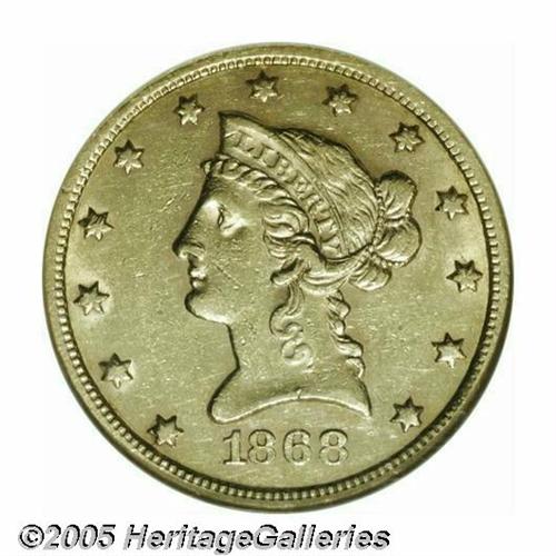 <B>1868-S<$10> AU55 NGC.</B></I> Except for 1875, the San Francisco Mint struck Eagles every year between 1854 and 1889. However, mintages were very low between 1855 and 1878, and usually did not reach 20,000 pieces. The 1868-S is a typically rare issue, only 13,500 pieces were struck, none of which have been certified in Mint State by either NGC or PCGS. No one collected Eagles by date and mintmark in the old west, where such pieces were strictly regarded as bullion until the next century. This pleasing piece has substantial luster, a good strike, and no obtrusive bagmarks. Population: 19 in 55, 11 finer (4/05).