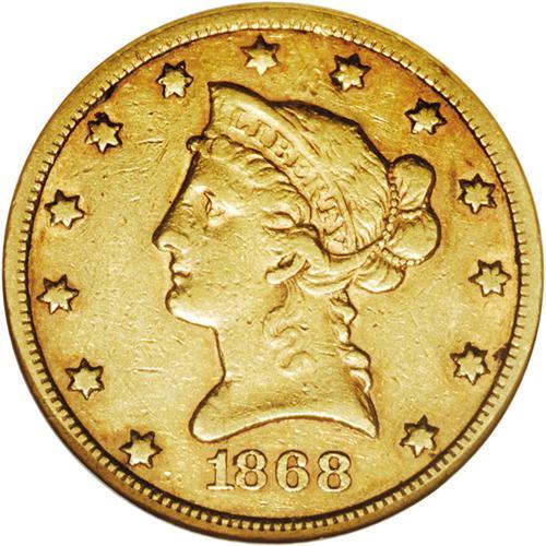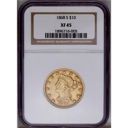 <B>1868-S $10 XF45 NGC.</B></I> The surfaces have an underlying brightness beneath the rich reddish patina that surrounds the outer devices. Softly struck, as always seen, the most obvious marks for pedigree purposes are in the left obverse field and above the eagle's beak.