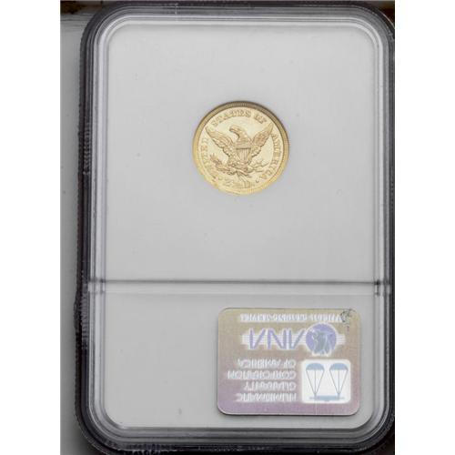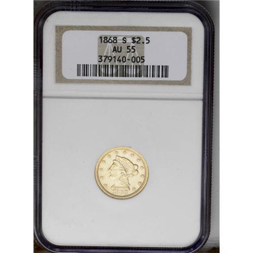 <B>1868-S<$2 1/2> AU55 NGC.</B></I> Traces of highpoint wear do little to impede the luster of this reddish-gold quarter eagle. Light abrasions pepper the coin, the most notable one stretching across the bun of hair. Akers estimates that only around 200 examples survive in all grades.