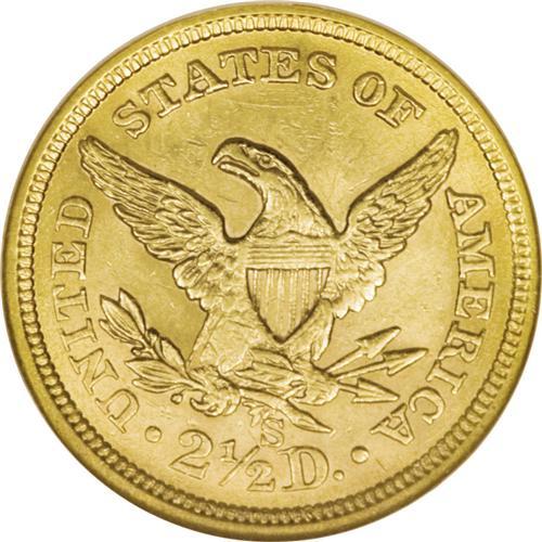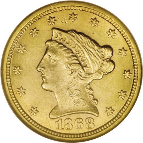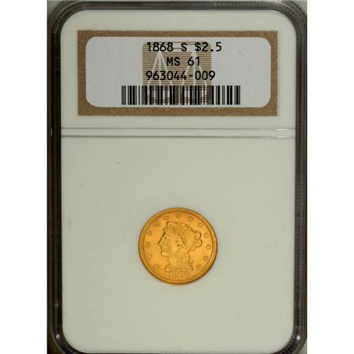 <B>1868-S $2 1/2 MS61 NGC.</B></I> While not considered to be in the same class with S-mint quarter eagles from earlier in the decade, the 1868-S, of which a moderate 34,000 pieces were struck, is a scarce coin that is decidedly rare above the XF level. This piece is sharply struck in all areas except the eagle's left leg, and there are only a few small marks that are largely confined to the obverse field. Census: 9 in 61, 11 finer (12/06).<BR><I>From The Twin Hollows Collection.</B></I><BR><BR><b>Shipping:</b> Coin/Currency (<a target="_blank" href="http://www.heritageauctions.com/common/shipping.php">view shipping information</a>)