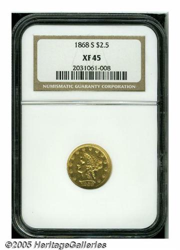 <B>1868-S<$2 1/2> XF45 NGC.</B></I> This well detailed example is lightly worn, with substantial semi-prooflikeness remaining on the green-gold surfaces. A number of superficial field blemishes are evident on each side of the piece. This is a scarcer, low mintage, frontier issue that is difficult to locate in all grades.