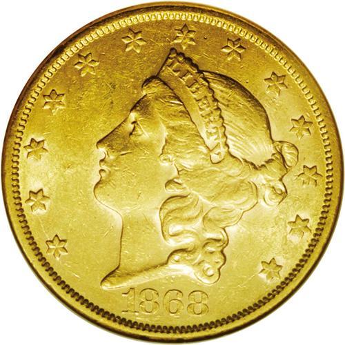 <B>1868-S<$20> AU58 NGC.</B></I> An issue that is seldom offered in Mint State, this coin exhibits bright reddish-gold in color with ample remnants of original luster. The strike is typical for a Type Two double eagle, but there is perceptible rub on each side. A number of contact marks are mentioned particularly on the obverse.